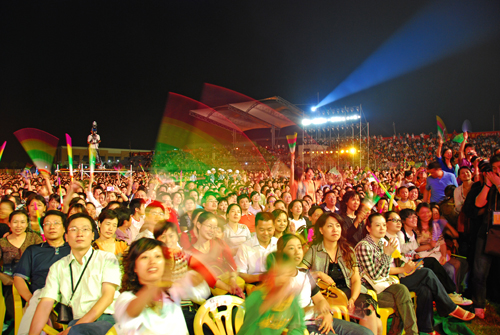 9月28日晚上,必赢官网体育场欢声笑语,音乐阵阵,2006中国(衢州)国际孔子文化节大型文艺晚会在这里举行。 这台主题为“南孔圣地、和谐衢州”的CCTV-3走进衢州大型文艺晚会由市委、市政府和中央电视台主办。晚会汇聚了王力宏、韩红、梁静茹、张洪量、唐磊、沙宝亮、哈辉、邰正宵和高胜美等9大明星,阵容强大,真可谓是一场豪华“夜宴”。 晚会在大型舞蹈《南宗乐舞》拉开序幕。演员们敲打着大鼓,男生和女生手持祭祀托盘和编钟,吟声唱着,舞蹈演员跳着古代的舞蹈,音乐的基调庄严凝重,仿佛把人的思绪带到南宋时代,眼前似乎浮现出大宗南渡的历史画面,现场气势恢弘,蔚为壮观。 明星的出场是最煽情的。“有没有现场的小伙子愿意和我合唱?”来自台湾的当红歌星张洪量一出场便被衢州人的热情所感染,邀请台下观众合唱《为什么你背着我爱别人》。“我愿意!我愿意!”顿时,整个会场沸腾了,与自己的偶像同台演唱的梦想在那一刻得以实现。台上张洪量和3名观众声情并茂地唱着,台下万千观众尖呼狂叫,有的索性站在了椅子上,挥动着银光棒,跟着动感的节奏舞动起来。 当《爱你不是两三天》这熟悉的音乐响起,观众们禁不住跟着旋律轻声唱了起来。沙宝亮的《暗香》、唐磊的《菊花香》、韩红的《来吧》、王力宏的《盖世英雄》等14个精彩节目将现场气氛推向了一个又一个高潮,让观众们充分领略了歌星们的风采。 “今天真是过瘾,没想到在衢州也能看到如此高规格的文艺晚会。”夜晚11点,晚会结束,但家住市区的王欢仍兴奋不已 。她告诉记者,早在几个月前就开始期待这富有意义的一天了,作为衢州人,这一天觉得特别骄傲和自豪。儒学论坛、祭孔,让她对儒学在当代的现实意义有了更深一层的理解,晚上的文艺晚会更是让她感受了衢州正在快速发展的经济,她希望以后衢州能多举办一些高层次的活动。