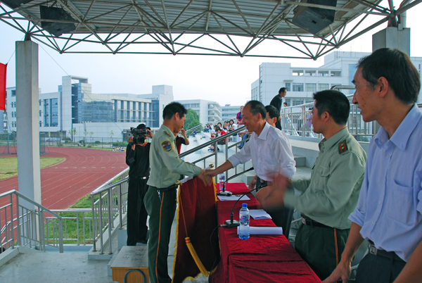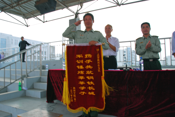 最后,校领导叶长明向军训团团长熊卫国赠送了锦旗。至此,2006年军训总结表彰大会圆满落下帷幕。(文/霄毅 )