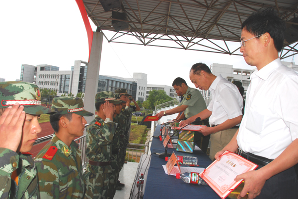 沙场秋点兵,军威写青春。 大会第一阶段是汇报表演。教官和学员分别进行了汇报表演。格斗、摔跤、擒拿,立正、稍息、跨列,教官和学员的精彩表演,博得了在场同学们的阵阵掌声。表演结束后,表彰大会正式开始。 校领导宣读了2008级学生军训工作优胜集体和先进个人名单。校领导和武警部队首长为军训工作优胜集体和先进个人颁奖,他们对所有参训成员圆满完成军训任务表示祝贺,对学员们取得的成绩给予了充分的肯定。 校领导向衢州市武警支队赠送了锦旗,感谢他们对此次军训的大力支持。 叶长明同志代表校党委、行政对这次军训取得圆满成功表示热烈的祝贺,向支持必赢官网军训工作的衢州市武警部队官兵表示诚挚的谢意,向在军训中取得优异成绩的先进集体和个人表示热烈的祝贺。他说,在军训中,同学们经受住了各种考验,增强了承受困难和挫折的勇气,提高了战胜困难、战胜自我的信心。同学们在教官的教导下,不仅学到了军事技能,军事理论,而且还学到了部队官兵的好思想好作风,增强了组织纪律观念,集体主义和爱国主义情操得到了进一步升华,显示了当代大学生的良好风貌 。他希望,同学们在今后的学习生活中要不断增强国防观念,牢固树立国家安全意识;进一步增强组织纪律观念,弘扬团结协作精神;保持和发扬军训取得的成果,积极投入到新的学习生活中去,努力成长为有用之才。 军训,是磨练意志的沙场,更是铸就团结的基地。相信通过军训,必赢官网新生们会更加团结,更能吃苦,真正成为一名合格的社会主义接班人!(宣传部陈娅)
