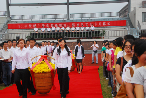 在升国旗、唱国歌仪式后,2009级新生代表和新教师代表向孔子像敬献花篮,全体师生向孔子像行鞠躬礼,师范类学生向先师敬辞。