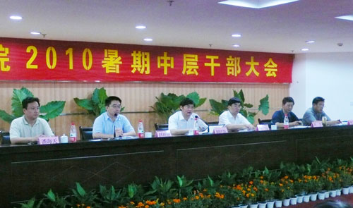 为认真学习全教会精神,贯彻落实《教育规划纲要》,进一步明确办学目标,统一思想,集思广益,努力推进我院特色鲜明的应用型本科院校建设,8月30日、31日,我院集中两天时间召开了暑期中层干部大会。学院党政领导、全体中层干部、省市人大代表和政协委员、在职教授、民主党派负责人、各系部(中心)办公室负责人参加了本次大会。胡建新书记、胡伟院长分别在会上讲话,赵祖地、叶碧、潘海天、姚宏昌等领导分别主持会议。