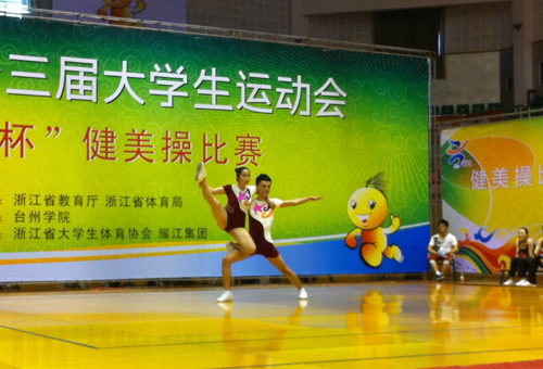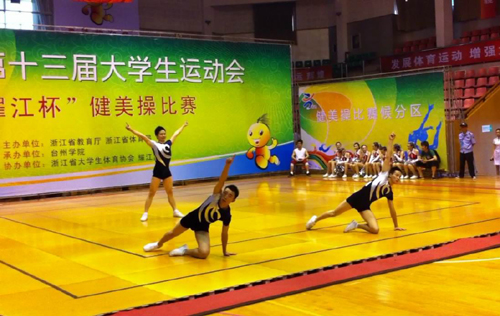 6月1日下午,浙江省第十三届大学生运动会“耀江杯”健美操比赛在台州闭幕。来自全省24所高校的318名运动员参加本届大运会健美操甲组(公体组)和丙组(体育专业组)的比赛。在两天时间里,运动员进行了男女单人操、双人操、组合操、六人操、八人操、啦啦操等21个项目的角逐 。