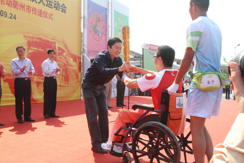 杨杰从衢州市委副书记、市长尚清手里接过火炬