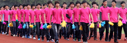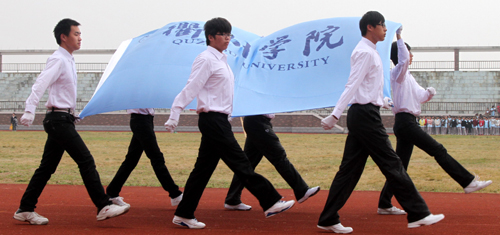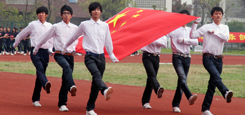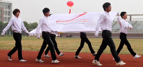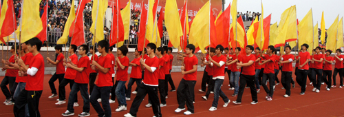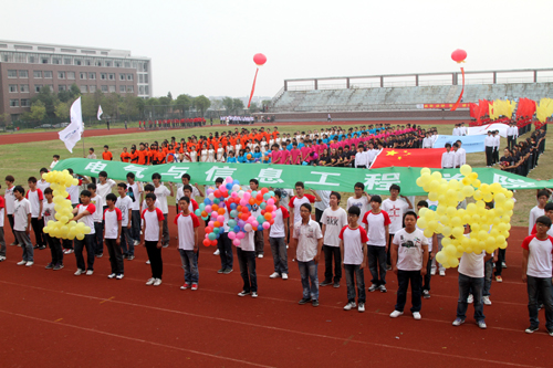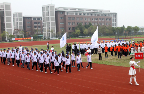 激昂的运动员进行曲响起,庄严的国旗、校旗、会旗方阵依次入场,紧随其后的是由各学院大学生组成的鲜花、彩带、气球、花环、彩旗方阵,运动员方阵和裁判员方阵高喊口号,排着整齐的列队,有序进入运动场。各学院对此次运动会极为重视,进行了认真训练和准备,运动员们昂扬的姿态和饱满的精神,赢得校领导和在场观众们阵阵热烈的掌声。