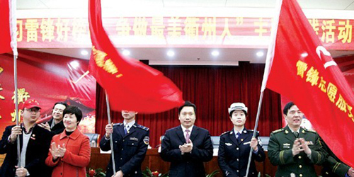 衢州市委书记赵一德在启动仪式上讲话,号召全体市民向雷锋同志学习、争做最美衢州人,要有甘当“傻子”的信念,要有甘当“人民勤务员”的境界,要有甘做永不生锈“螺丝钉”的品格,要有善于挤和钻的“钉子”精神,在创新中解决矛盾,在探索中创造经验,在建设“两地三城”、加快“两个崛起”、实现富民强市的实践中,贡献自己的忠诚、智慧和力量。