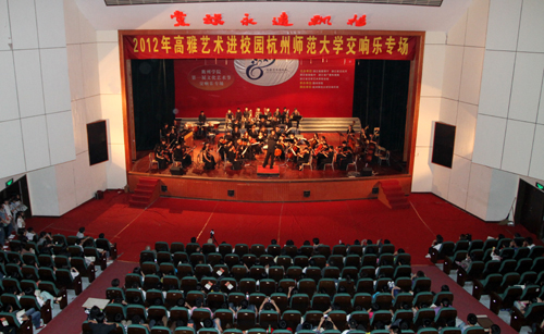 5月9日晚,由中共浙江省委宣传部、省教育厅、省文化厅等单位共同主办的2012年高雅艺术进校园――必赢3003no1线路检测中心交响乐专场演出在校大会堂隆重举行。学校党委宣传部负责人在演出开始前致辞,热烈欢迎前来必赢官网演出的杭州师范大学交响乐团全体演职人员。校长胡伟、党委副书记赵祖地和千余名师生代表一起观看了演出。
