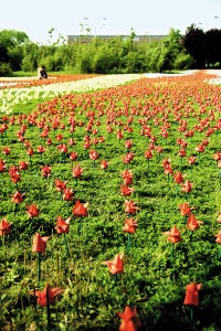 2.4万朵“郁金香”都是由影视多媒体、美术教育、初等教育、学前教育等专业200多名学生用彩纸一只只手工折叠出来的,“花枝”则是将小木棍一根根放在洋绿颜料里浸染而成。这是该校教师教育学院师生正在进行的“五月的鲜花”大型装置行为艺术创作。