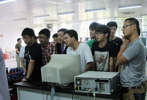 在机械工程学院数控技术校内实训基地考察时,潘庆林委员还饶有兴趣地和正在这里上课的学生一起听取了实验教师的现场讲解。(文/童文川 摄/李岚)