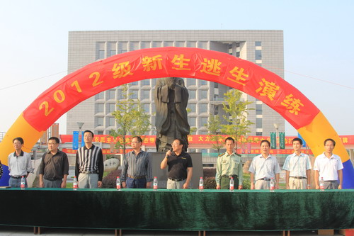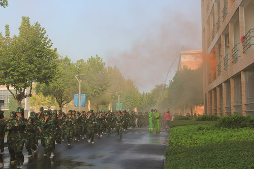 下午4点整,消防警报突然响起,学生公寓竹香苑二层及三层两房间突然“失火”,滚滚浓烟从阳台向外涌出,情况十分危急。正在楼内学习和休息的同学,闻“警”而动,快速从公寓内紧急疏散。同学们采用湿毛巾蒙鼻、弯腰等方式防止火场浓烟呛入,并有秩序地从各自楼层开始逃生。5分钟后,全体新生均从危险区域撤离到孔子广场前的安全地带。同时,消防官兵和学校消防员根据现场发布的灭火指令,调集消防车辆,在楼前平坦地面上铺设水带对火源进行扑灭。武警教官在现场清点人数并向现场总指挥报告,演习圆满完成。
