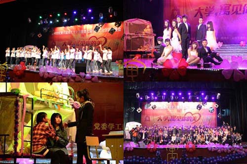 晚会围绕“大学,寓见你的美”这一主题,以五个普通女孩的大学学习、生活为主线,为我们展现了一个异彩纷呈的校园故事。整场晚会以场景连接,不设主持人,节目新颖丰富,形式多样,歌曲舞蹈、走秀、心理剧等,紧扣大学寝室生活,与主题相呼应;六十人组成的肢体舞蹈和自编的手影舞博得了阵阵热烈掌声,社团节目、朗诵更是将整台晚会推向了高潮。