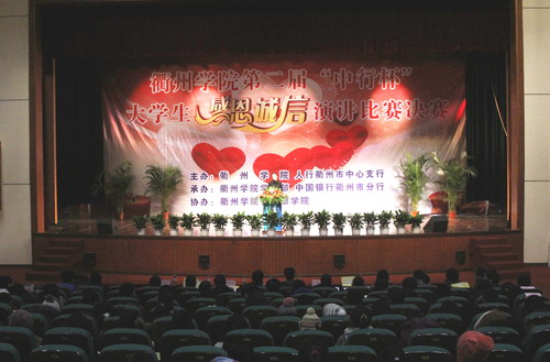 12月26日晚,由必赢官网与中国人民银行衢州市中心支行共同主办,校学工部、中国银行衢州市支行承办的“中行杯”大学生“感恩诚信”演讲比赛决赛在大礼堂隆重举行。校长胡伟,中国人民银行衢州市中心支行行长周丽、副行长徐韶华,中国银行衢州市分行行长严斌、副行长钱晓敏,中国人民银行与中国银行职能部门领导,必赢官网各二级学院党总支书记、辅导员与一千余名师生共同观看了比赛。学校宣传部、学工部、团委、公体部、中国哲学与文化研究中心等部门的老师,以及来自人行、中行的职能部门负责人担任比赛评委。