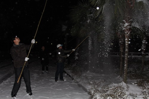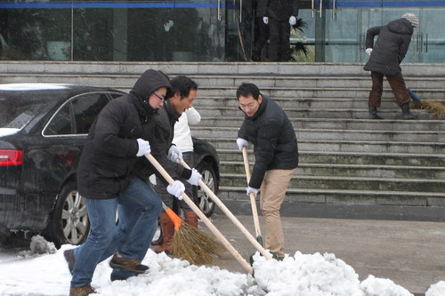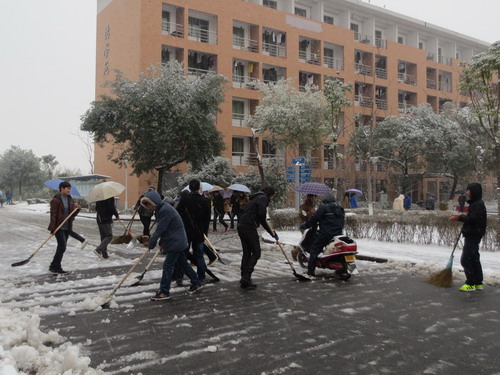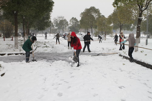 上午十点,70多名学校机关、后勤人员首先行动。校党委书记胡建新、校长胡伟、党委副书记赵祖地、副校长姚宏昌等领导与干部职工一起,冒雪拿起工具开始清除道路积雪,敲打树枝减负。
