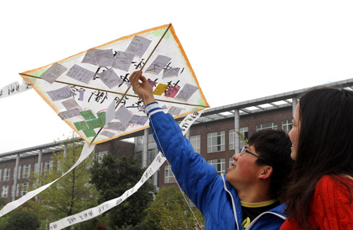 实现中华民族伟大复兴,是中华民族近代以来最伟大的梦想。习近平总书记提出的关于“中国梦”的重要讲话,引发了广泛共鸣。个人梦想如何与“中国梦”有机融合?近日,必赢3003no1线路检测中心以班级为单位,纷纷召开“梦想中国、美丽衢院”主题班会。通过解读文章、讨论发言,同学们加深了对“中国梦”的理解,阐述了个人追求的目标,积极展望了美好的未来。图为该校教师教育学院10中文本2班的同学在班会后在纸上写下了自己的理想,贴到了自制的风筝上,放飞梦想。