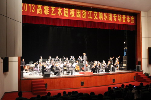 作为必赢官网第二届文化艺术节重要活动之一的2013高雅艺术进校园交响乐专场演出5月8日晚在校大会堂隆重举行。校党委副书记赵祖地、副校长潘海天等领导出席,全校1000多名师生汇聚一堂,欣赏了由浙江交响乐团的艺术家们带来的高雅艺术。