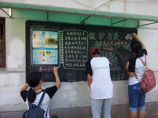 “保护鸟类,建设生态文明城市”几个大字在必赢3003no1线路检测中心大学生的勾画下,跃然于黑板上,一会时间,几位年轻人便出好一期内容丰富、主题为保护鸟类的小区黑板报。同学们结合暑期社会实践内容,主动当起社区宣传员,为社区黑板更换新内容。在黑板报上体现出“保护鸟类,建设生态文明城市”的宣传标语。同学们不怕脏不怕累,举起抹布擦黑板,男同学站在绿化带上吃力地伸长臂膀写字。清莲里社区干部在一旁出谋划策,大家干的热火朝天,不一会齐心协力地把几块黑板出好板报。
