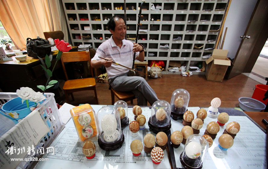 蛋雕是门“破碎的艺术”,稍不慎就会功亏一篑。多年来,潘夏皓不知雕碎了多少个无辜的鸡蛋,但也成功雕出了许许多多栩栩如生、巧夺天工的蛋雕作品。功夫不负有心人,如今,他的蛋雕作品得到了越来越多认可,还获得了衢州市“民间工艺大师”称号。很多大学生常在业余时间来到那间小小传达室,跟着他学习蛋雕。这位谦逊平和、无私传授的传达室大叔,也有了个亲切的称呼:“潘叔”。(摄影、文字/龚诚良、傅震茂)