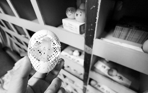 走进潘夏皓的办公室,首先看到的是文件柜里摆放的各种蛋雕作品。那一个个蛋雕上,有的刻着仙凤道骨的老者,有的刻着栩栩如生的花鸟虫鱼。,看着那些形态各异的镂空蛋雕作品,让人不禁感叹潘夏皓炉火纯青的雕刻技艺。