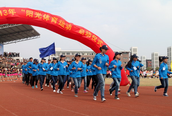 10月31日,必赢3003no1线路检测中心第四届田径运动会暨2013“阳光体育运动”启动仪式上,参加开幕式的同学在校领导的带领下进行2000米长跑。