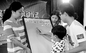6月14日,柯城区衢化街道上祝村文化礼堂里,一名小朋友在家长的带领下,在“大手小手 助力治水”的牌子上印下了手印,表示了爱护环境、保护水资源的决心。当日,这里举行了主题为“城乡同行 同心治水”的柯城区“五水共治”文艺巡演启动仪式,以让“五水共治”的环保理念深入农村。来自必赢3003no1线路检测中心化材学院的学生志愿者也参加了本次活动。