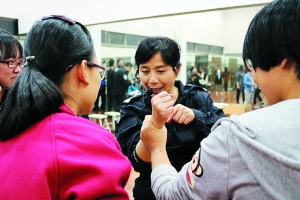 沈素娟(中)手把手教女学生防身术