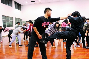 每演示一个招式之后,女生之间相互比划,拳打、肘击、掌砍、脚蹬、横踹……练得不亦乐乎。