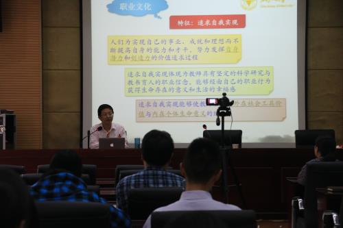 祝怀新教授围绕“高校教师文化及其基本要素和构建障碍、如何构建学习型组织”三个问题展开阐述。结合多年从事高校教育改革研究的经历,运用典型生动的案例,指出高校教师文化包含职业文化、学术文化、教学文化、学科文化和交往文化等五项基本要素。认为高校教师文化普遍存在价值取向功利化与价值目标短期化、个人主义工作方式与派别主义文化心态以及严格的科层制与教师精神的弱化等构建障碍。祝教授关注学习型组织的构建,强调同伴互助模式对教师专业发展的重要性,建议可利用学科教研组和任课教师组定期碰头互动交流两种方式,通过教师之间的高度合作,共同努力提升教师专业素质。