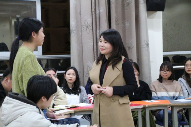 徐建芬老师首先进行团队破冰训练,以“拳头”小游戏开场,鼓励在场学生对“如何打开别人拳头”这一问题进行思考互动,同学们积极配合并与徐老师敞开心扉、交流互动。伴随着欢声笑语,徐老师引出“空杯心态”概念,她希望同学们在大学中能够主动敞开、接受,让自己的能力得到提升并使大学时光变得热气腾腾。