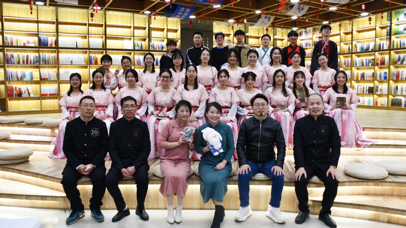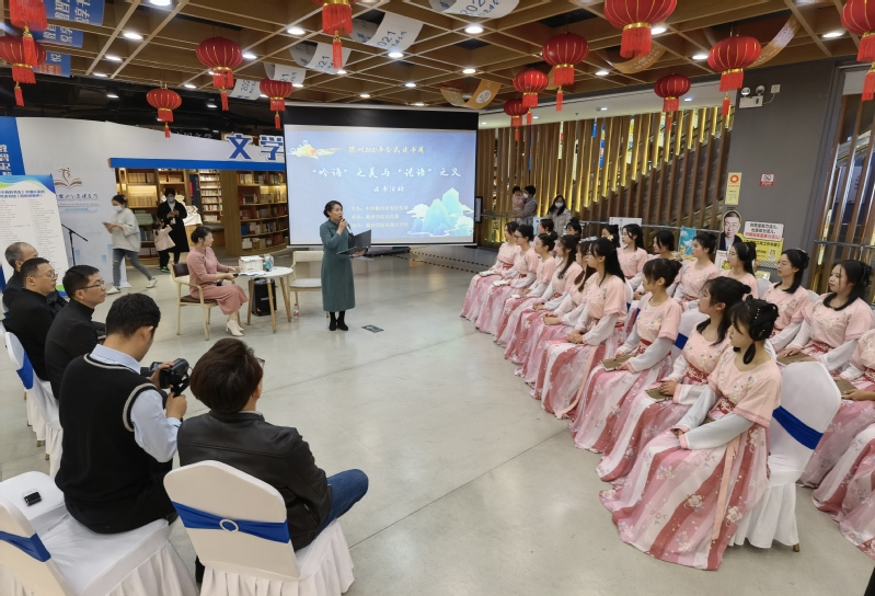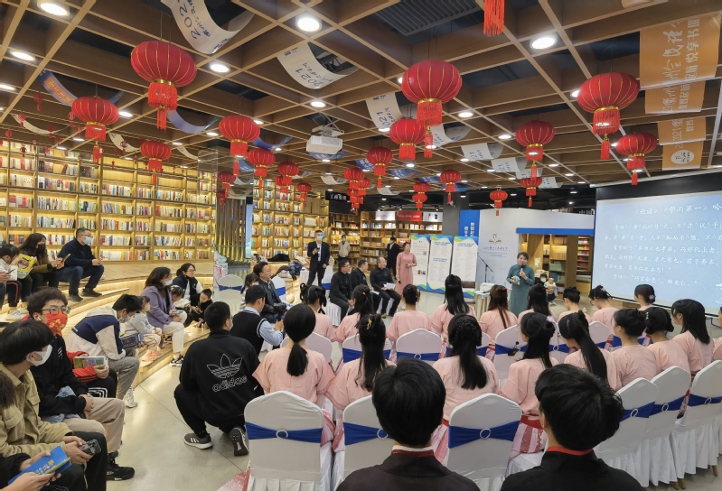 在新华书店二楼的活动现场,身着汉服的必赢3003no1线路检测中心师生们和广大市民朋友一道,同诵《论语》,共品经典。