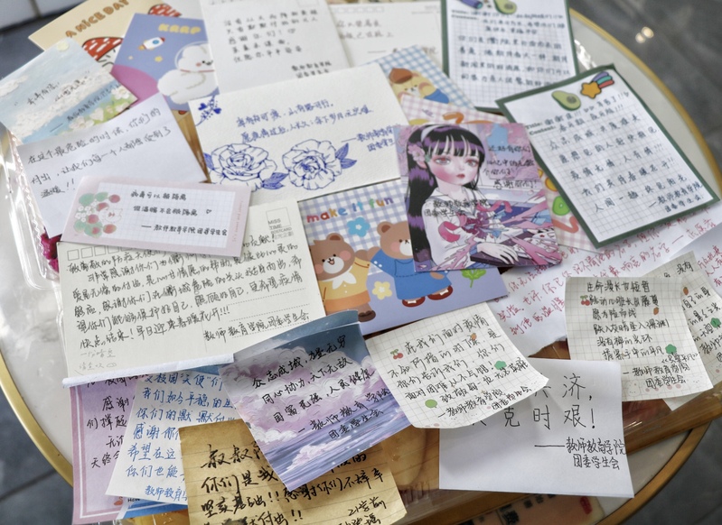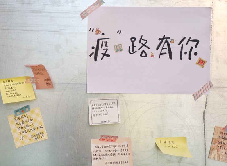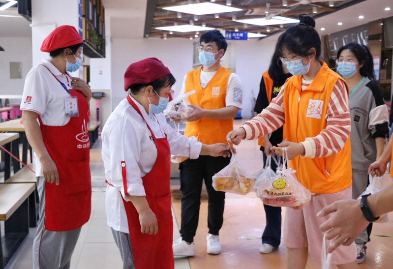 教师教育学院的同学,最暖心。在各幢寝室楼下,教院学生在小黑板上写下祝福语和相互鼓励的话语。院团委学生会还组织了一场感谢后勤工作者们的祝福活动,为食堂叔叔阿姨们送上贺卡,还有清甜可口的水果,孩子们的灿烂笑脸和温暖的拥抱,让后勤服务工作人员湿了眼眶。