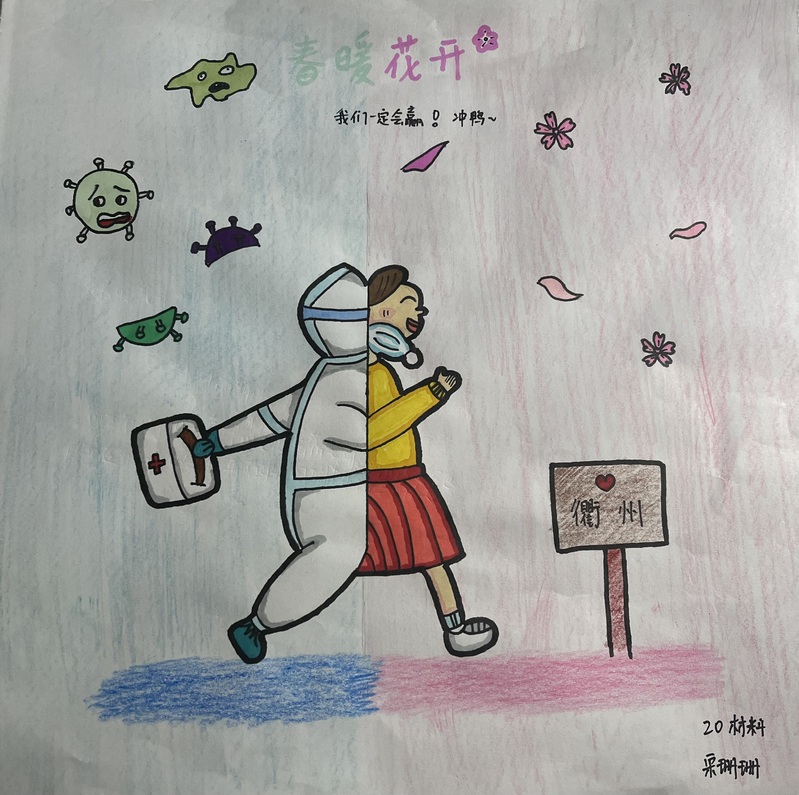 这一幅画,是20材料宋珊珊同学创作的《春暖花开》。画上的人物,是一个人却又不是一个人,准确的说是两个完全不同的人,各选取了一半而组成的。人物的左边是与病毒作斗争奔跑着的医护人员,人物的右边是一个快乐的女孩奔向春天。宋珊珊同学说,这幅画取名《春暖花开》蕴含着我的期盼。在一个本该春暖花开的季节,衢州被新冠肺炎疫情所笼罩。愿凛冬消散,春暖花开,再无国殇。还有林宇暄、代欢、裘佳、冯文青、张欣怡等同学制作的搞疫海报也令人震撼,化材学子们用文艺作品传递着齐心抗疫的精神力量。