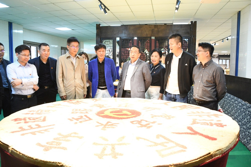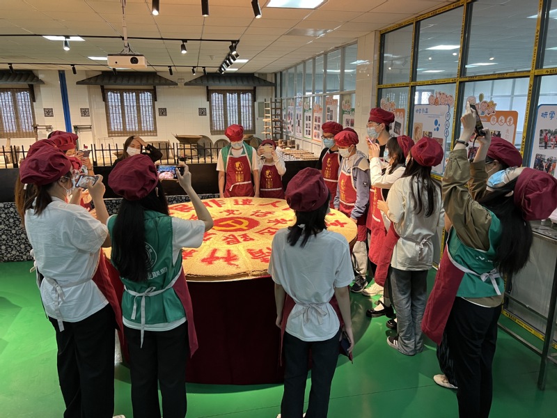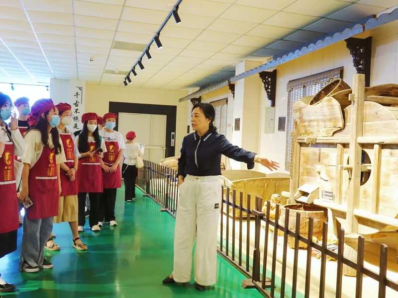 师生们在邵永丰非遗基地大厅观看了邵永丰麻饼文化的宣传视频,对其历史和文化进行初步了解。进入邵永丰麻饼文化博物馆,参观学习麻饼的起源、农耕文化与麻饼的发展历程、麻饼的制作流程以及“邵永丰”麻饼与孝文化的故事。博物馆中陈列着千百年来用以生产和制作麻饼的农具与栩栩如生的泥塑,兼具历史感与趣味性。