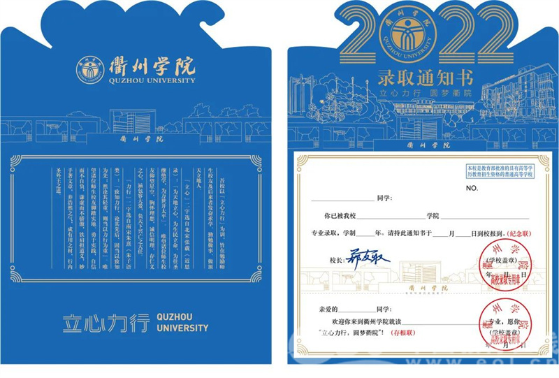 收到这份录取通知书就将成为衢院的一员,和众多人一起共享“衢院学子”这个称号。学校愿这份诚意满满的录取通知书带新生开启精彩大学生活。已录取考生也可关注微信服务号“EMS中国邮政速递物流”或通过支付宝生活号“EMS中国邮政速递物流”及时了解自己通知书的派送状态。