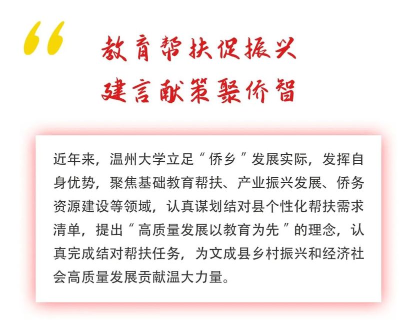 聚焦教育帮扶,助力山区教育公平。按照省委“新型帮共体”建设要求,坚持“乡村振兴是一盘大棋”的理念,以基础教育为切入点,找准目标定位,统筹做好战略谋划。学校与文成县正式签订《温州大学-文成县助力乡村振兴教育帮扶与合作暨助力侨益法律保护研究合作协议》,制定2022年项目计划表,构建“教育项目帮扶、师资培养、教科研指导、教育信息化合作”等四大合作领域。在文成县举办“温州市第九届学前教育区域特色品牌建设现场会暨幼儿园课程改革推进会”“文成县第六期校长论坛”“文成县教师科研素养提升行动”等系列活动。2022年落实经费10余万,组建13位专家帮扶团队,协助文成县加强中小学、幼儿园的综合管理,共同申报教研课题、联合开展科研攻关、一体开发区域特色课程。