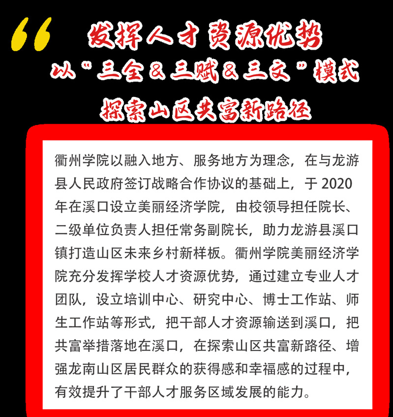 发挥科技、管理等专业人才优势打通“三赋通道”,助力人才引领山区高质量发展。建立乡村振兴培训中心,派遣干部师资在龙南山区持续推进乡村版未来社区建设培训、农村职业经理人培训、农村电子商务培训、SYB创业培训、农民信息员培训、家庭农场主能力提升培训、网格员培训、村播(农播)带头人培训等各类专题培训。与龙南山区地方政府合作共建博士创新站,博士领衔破解企业难题,结合山区农业、竹笋产业、旅游产业等,有效推进富硒笋竹农业种植技术提升、竹编工艺产品3d展示仿真建模、农文旅规划等科技助农项目落地。组建创新创业团队,以新时代青年“上山下乡”双引双创工作为抓手,与当地政府合作参加浙江省大学生乡村振兴创意大赛、浙江省大学生电子商务大赛,共同举办“溪口杯”乡村未来社区创新创业大赛等创业赛事,吸引了为数不少的创业团队和创业青年入驻龙南山区。