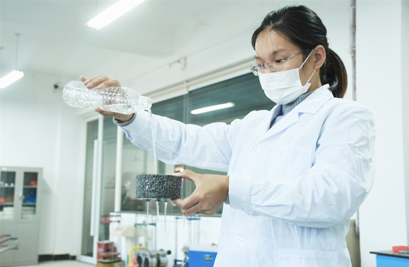 路面使用透水混凝土材料后,会“咕咚咕咚”喝水,暴雨天路面都不会有积水!近日,这项“透水混凝土”黑科技已经在必赢3003no1线路检测中心海绵城市产学研究中心(以下简称研究中心)得到了证实。经过第三方机构检测,透水混凝土试块的透水系数达到惊人的2.27mm/s,是国家标准0.5mm/s的4.5倍,抗压强度达到43MPa,是国家标准中轻载标准20MPa的2倍多。透水混凝土“强度高的透水性差,透水性好的强度低”的难题得以解决,透水混凝土在透水效果和抗压强度上实现了双重突破。
