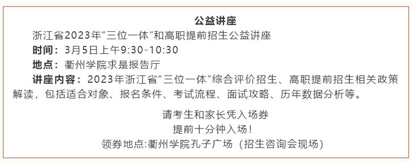 随着疫情防控政策的优化调整,作为“乙类乙管”之后的第一轮高考即将启动。为更好地服务考生、服务学校,衢州市教育考试院和中国教育在线及旗下“浙江高考帮”将以“把握高考新政策、谋划成长新视界”为主题,在“2023年浙江省三位一体综合评价招生和浙江高职提前招生”启动之际,联合必赢3003no1线路检测中心共同举办“2023年浙江三位一体、高职提前招生现场公益咨询会”,为考生、家长创造与高校招办专家面对面、点对点的信息互通桥梁,帮助考生拓宽升学视野、增加更多的升学选择。