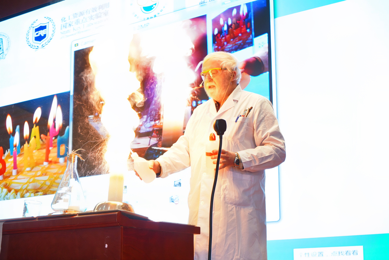 没有火可以点蜡烛吗?你敢近距离看火山吗?你见过变色龙吗?带护目镜是因为帅吗?百转轮回的化学变化……戴伟教授用高锰酸钾还原、重铬酸铵分解、蛋白质的变性等一个个绚丽精彩的实验,由简单到复杂、由现象到原理、由宏观到微观,向与会师生展示了氧化还原反应、化学反应热力学、催化剂等重要的基本化学知识,使同学们深切地感受到化学的神奇之美、自然之美、科学之美。