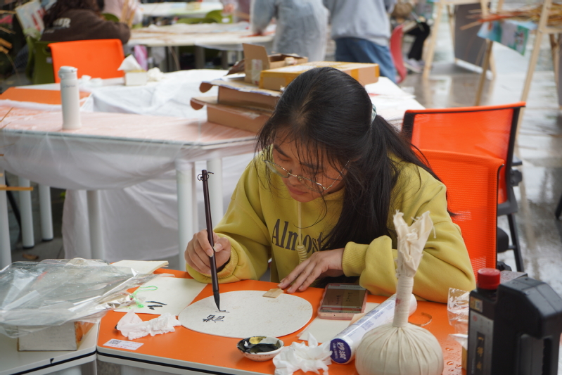 在非遗项目体验区,展台前琳琅满目的非遗作品,更是令人目不暇接。各大非遗学生社团纷纷秀出绝活,现场展示剪纸、蛋雕、针织、陶艺制作等技艺,并进行现场互动教学。同学们或画、或刻、或剪、或捏,青翠的小鸟振翅欲飞,精巧的莲花剪纸栩栩如生……惟妙惟肖的创作,为非遗文化增添了一抹别样的青春色彩。