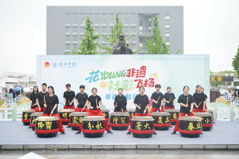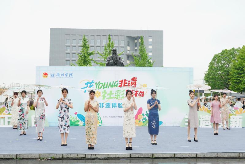 非遗专场演出在大学生鼓社铿锵有力的鼓点声中拉开序幕。鼓声响起,犹如激越浪潮,涌动着无限的青春与热情,展现了青年奋进的力量。京剧《锁麟囊》朱楼找球一折水袖翩翩,精心的演绎引人入胜,令人深刻感受中华戏曲艺术之美。藏族舞蹈锅庄舞豪爽奔放,或如鹰奋进,或飘逸洒脱,尽显青春朝气。浙江民歌《对鸟》清新爽健,带来别样的民族风情。动人心弦的琵琶独奏《龙船》、欢快喜庆的二胡重奏《良宵》、激昂澎湃的古筝重奏《战台风》、意境悠远的古琴演奏让人拍手称快。婀娜多姿的汉服舞、典雅端庄的旗袍走秀、动静相随的八段锦更是韵味无穷,彰显着青年的文化自信与自豪。