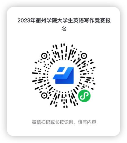 2023年5月14日前可通过微信小程序扫描下方的二维码,填写报名信息(姓名、学号、学院、年级和手机号码)。报名参赛的同学请加入QQ群:1108633543(2023必赢3003no1线路检测中心英语写作大赛交流群),比赛相关事宜会在群内公布。