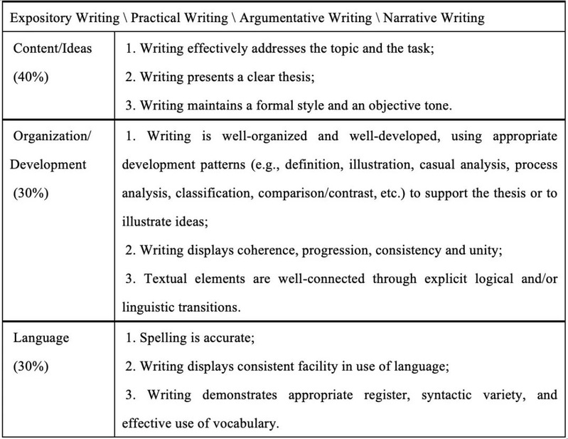 参考“外研社•国才杯”全国写作大赛决赛评分标准,兼顾学生写作语言、格式、内容、以及思辨能力,确保评分规范、公平、公正。“外研社•国才杯”全国写作大赛决赛评分标准详见下表:
