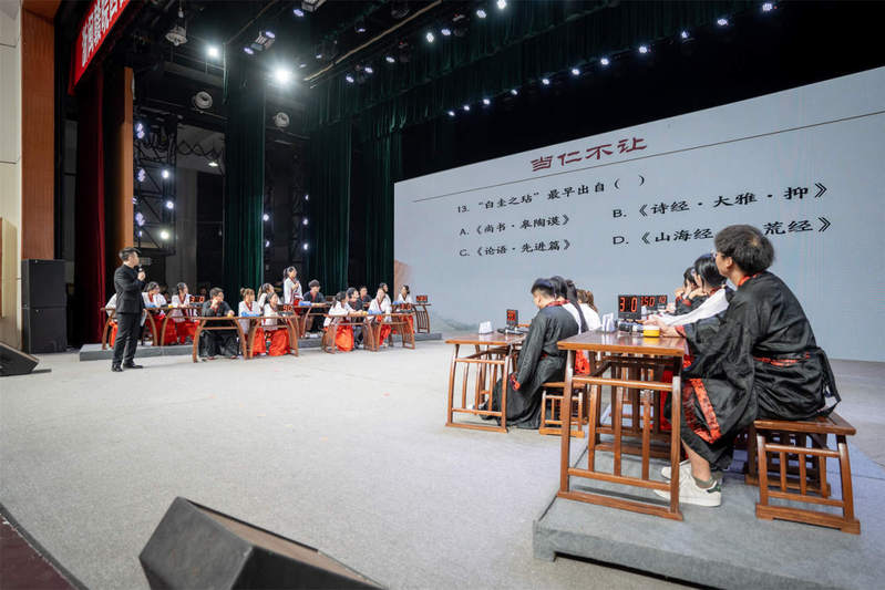 现场气氛热烈,扣人心弦。论语大会共设了如指掌、心有灵犀、当仁不让和勇者不惧4个环节,题型包括章句接龙、你比我猜、抢答、飞花令等形式,儒学经典更加“接地气”,更具“青春感”,也让同学们在学《论语》、赛《论语》的过程中,对中华优秀传统文化有更系统深刻的理解。