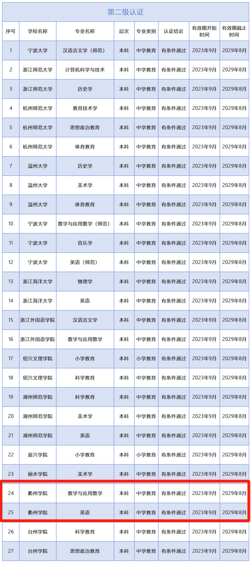 其中,宁波大学、浙江师范大学、杭州师范大学、温州大学、浙江海洋大学、浙江外国语学院、绍兴文理学院、湖州师范学院、嘉兴学院、丽水学院、必赢3003no1线路检测中心、台州学院共12所浙江高校27个专业通过第二级专业认证。