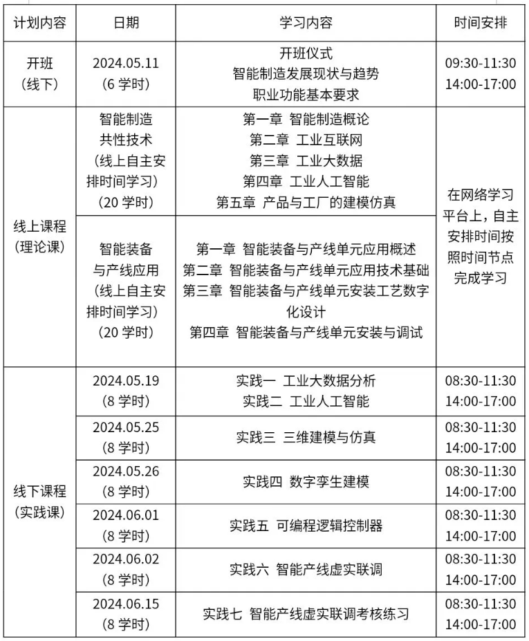培训采用“线上+线下”相结合的方式,共94学时(线上40学时,线下54学时),由智能制造师资团队根据《国家职业技术技能标准——智能制造工程技术人员》进行授课及线下实操训练指导。