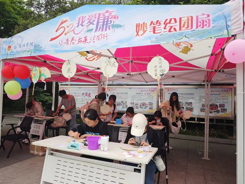 青年学子发挥巧思,执笔颂廉,挥墨写下“两袖清风心坦荡”“只留香气满乾坤”等诗句,感悟廉洁之美。以纸、扇等为媒,同学们围坐在一起,在一裁一刻中剪出多样“廉”字,在一描一画间绘出高洁“廉”花。现场还展出了独具匠心的廉洁主题作品,包括诗歌、海报、书法等,令人目不暇接,“心有所畏、言有所戒、行有所止”以多样化的方式走进师生心中。