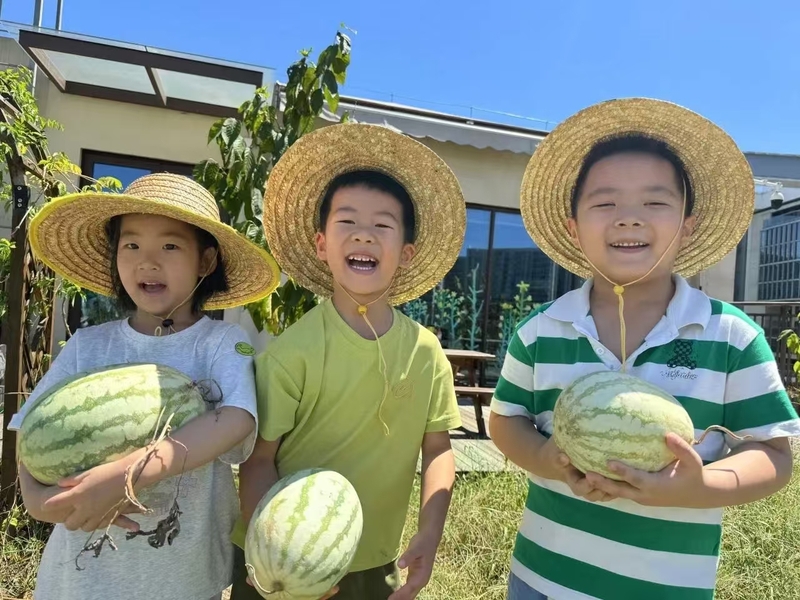 杭州市胜利笕成幼儿园云间农场里的西瓜成熟了,暑托班的孩子们纷纷戴上草帽摘西瓜,享受采摘果实的乐趣,孩子们还将西瓜送给夏日里努力工作的保安叔叔和环卫工人,共同“清凉一夏”!