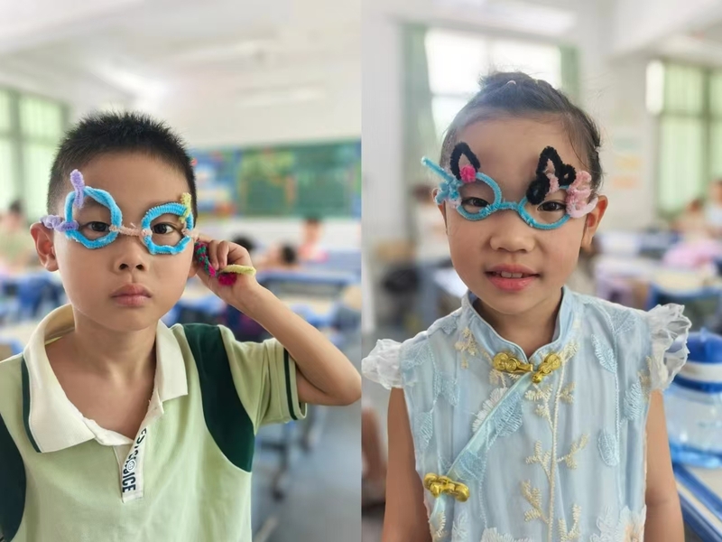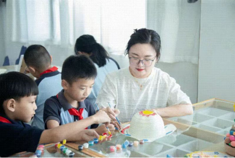 湖州市织里镇轧村小学结合学校的“知礼乐心”文化,在暑期托管班里开始了“乐心”特色手工课程。学生在老师的教授下,在鸡蛋壳上画画、在纸托盘上画纹样、自制太阳眼镜……每一件都是小小的艺术品。