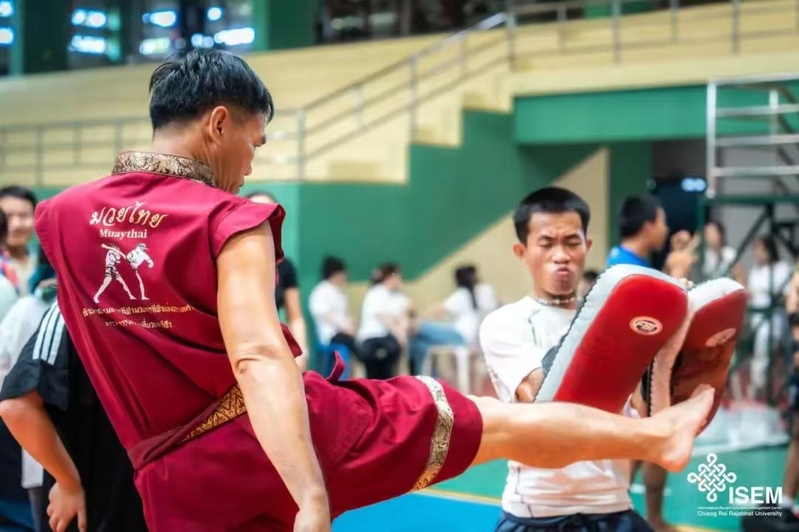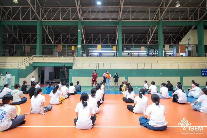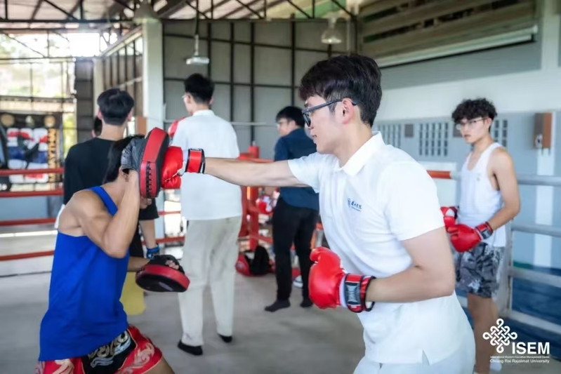 清莱皇家大学为研学团安排了具有泰国特色的课程。泰拳课上,赣老师为大家讲解了泰拳的基础动作,通过“示范+练习”的方式进行教学,同学们两两一组,他们或攻或守,或进或退,每一次出拳、每一次踢腿都凝聚着全身的力量与信念。赣老师还鼓励同学们与泰国学生切磋交流,同学们纷纷摩拳擦掌,出拳、踢腿,场馆内气氛热烈,喝彩声不绝于耳。课程的最后,同学们学习了泰拳文化中的拜师礼,向老师表达敬意和感恩。