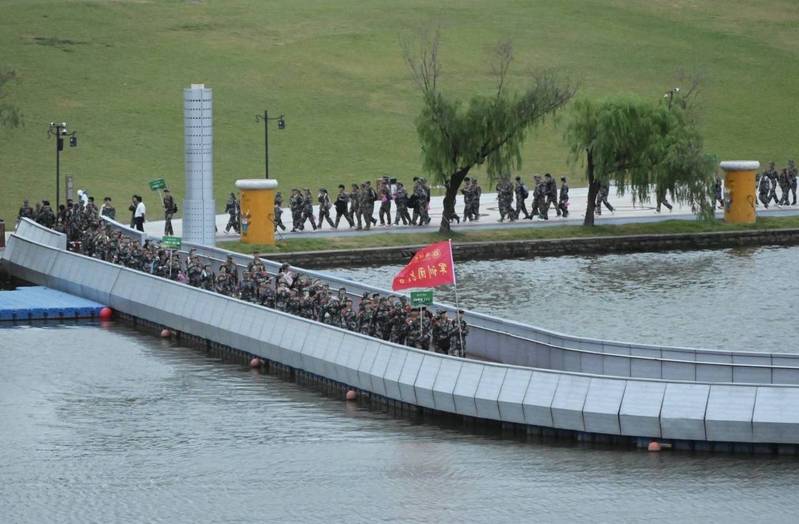 “泸定桥上只剩下13根铁索。由22名突击队员组成的夺桥突击队,冒着敌人的枪林弹雨,奋力攀上湿滑的铁链,向对岸发起进攻……”六营的同学们驻立在“飞夺泸定桥”的展架前,一字一句阅读着,革命先辈浴血奋战的激烈场景仿佛重现眼前。“虽然先烈已去,但是精神永存!当代青年,仍能冲锋!”伴随着一声令下,同学们踏上浮桥,快速过湖。
