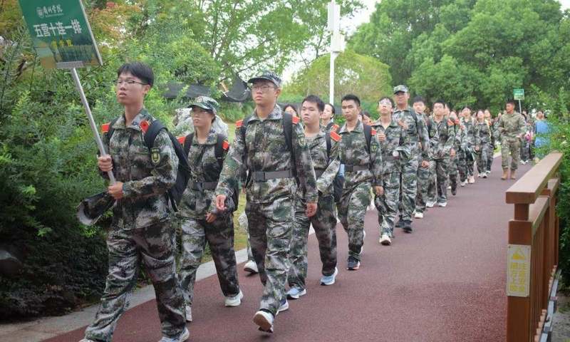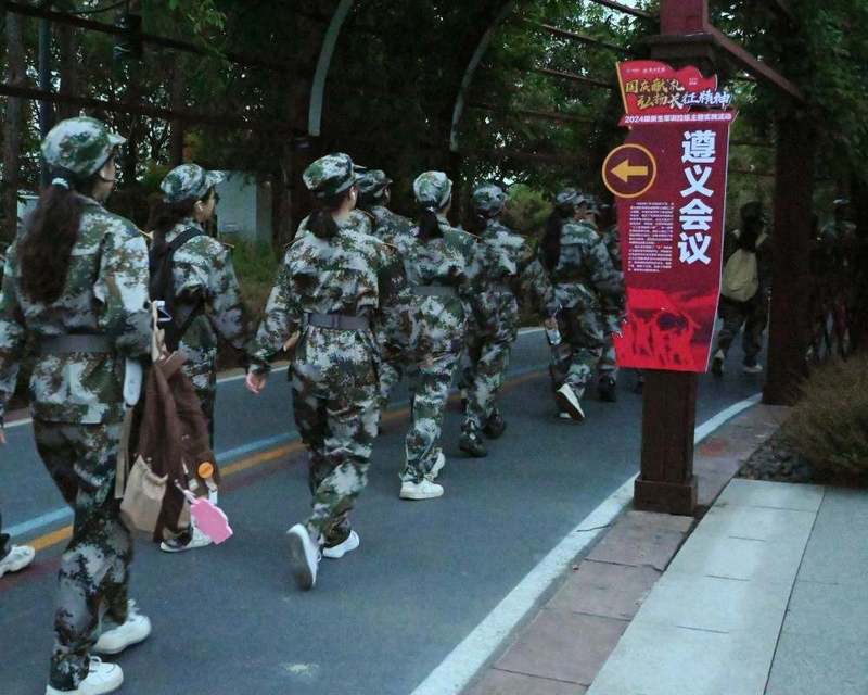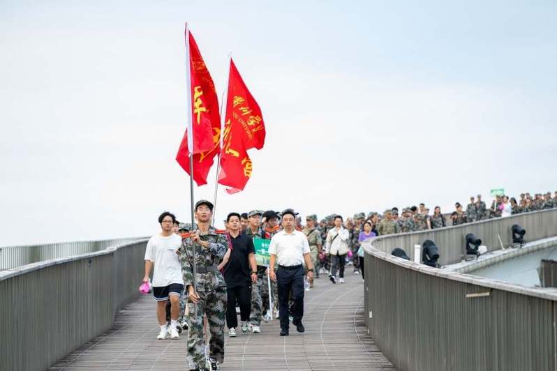 从星夜到清晨,同学们昂首阔步,携手并进。纵使脚底磨起水泡,汗水浸透衣衫,也不轻言放弃。帮忙拎水、一起扛旗、唱歌鼓气……历经约3个小时,经过穿越硝烟、情境模拟等多个环节,同学们最终胜利“会师”。